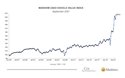 Wholesale values rose 27 percent last month from september 2020, according to cox automotive's manheim used vehicle value index, which tracks prices of cars and trucks sold at auctions. This brought the manheim used vehicle value index to 200.4, a 34.3% increase from a year ago and a 1.3% decrease from a high of 203 in may.